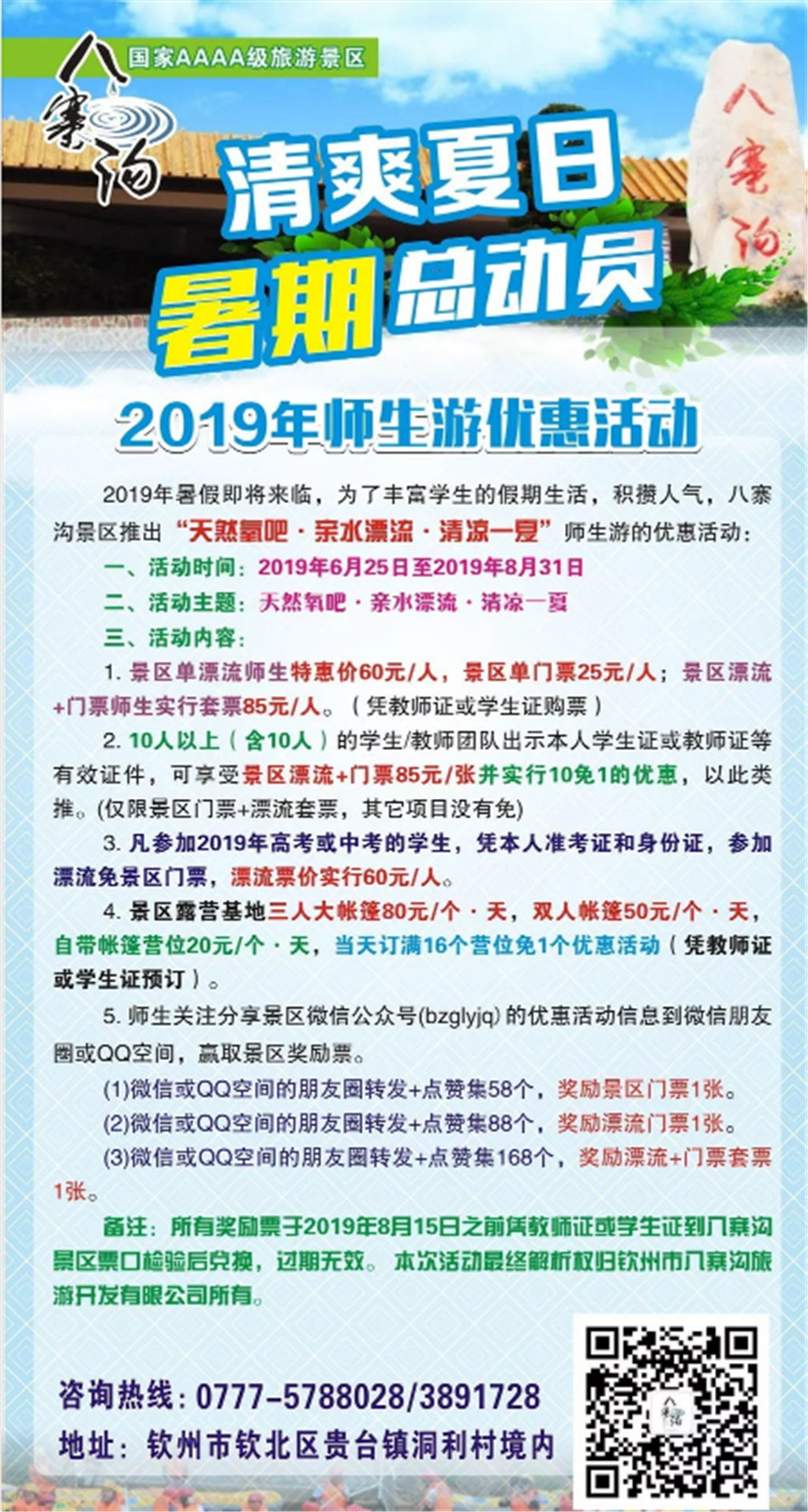 2019 年暑期將至,八寨溝景區(qū)推出暑期系列票價優(yōu)惠政策, 師生群體可享受景區(qū)門票半價, 八寨溝森林漂流特惠價, 關(guān)注景區(qū)微信公眾號并轉(zhuǎn)發(fā)朋友圈集贊, 贏取八寨溝景區(qū)門 票和森林漂流票等系列優(yōu)惠活動。