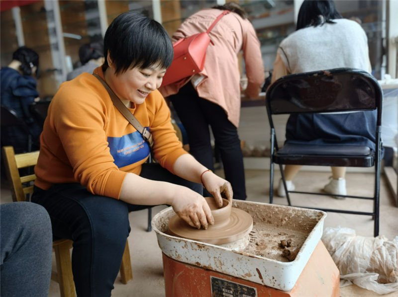 坭興陶文化體驗活動分為文化知識講解和制作體驗兩部分。文化館負(fù)責(zé)人詳細(xì)講解欽州市泥興陶歷史文化、成就,并帶領(lǐng)女職工們參觀陶器燒制現(xiàn)場和泥興陶成品,介紹泥興陶制作過程以及煙塵處理等知識。在陶藝制作體驗環(huán)節(jié),女職工們認(rèn)真觀摩陶藝?yán)蠋煹牟僮餮菔纠吆偷窨蹋⒂心S袠拥闹谱?,雖然制作出來的作品相對粗糙,但大家如獲至寶。