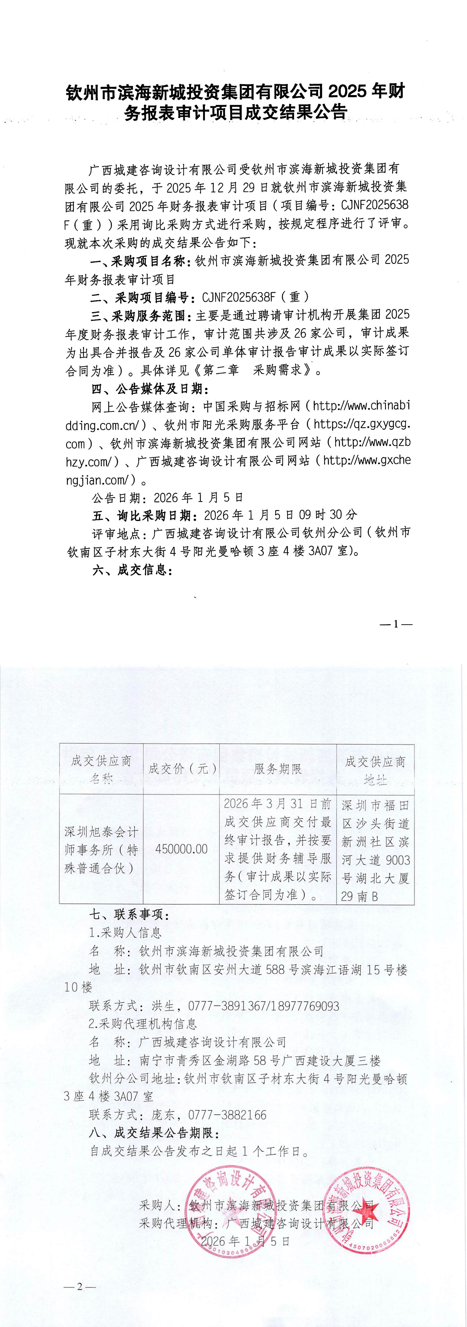 欽州市濱海新城投資集團有限公司2025年財務報表審計項目成交結(jié)果公告