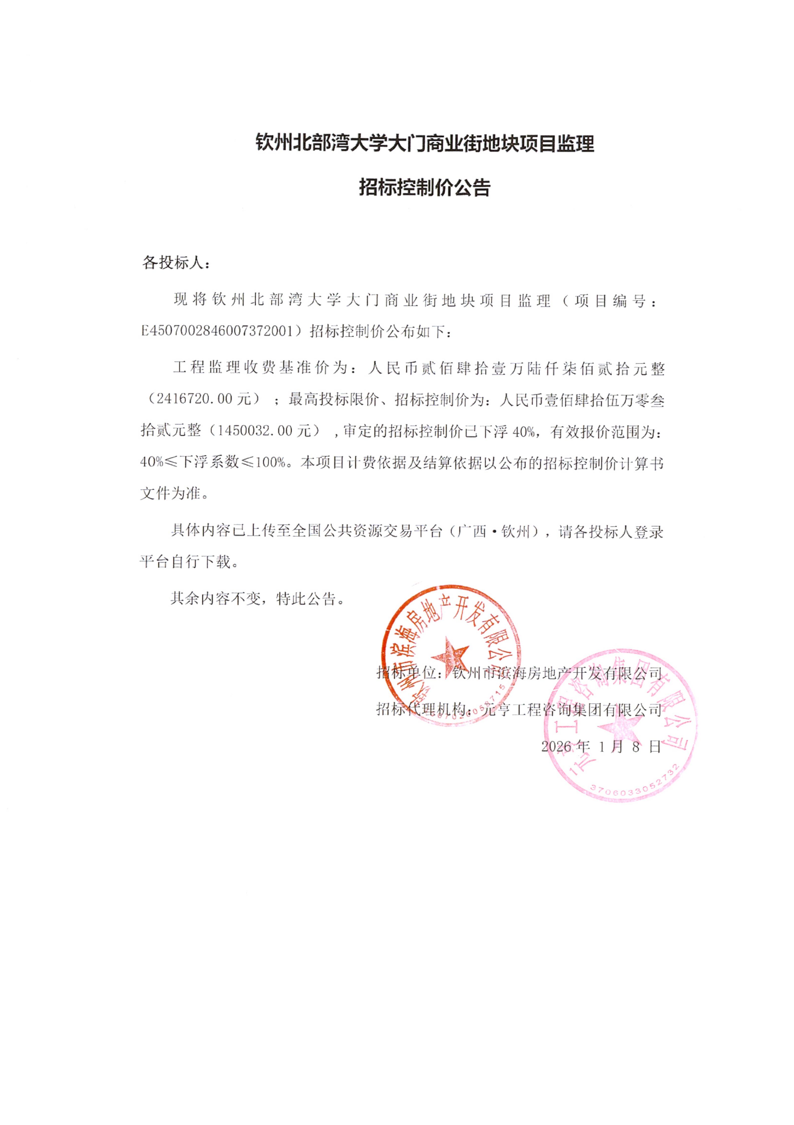 欽州北部灣大學大門商業(yè)街地塊項目監(jiān)理招標控制價公告