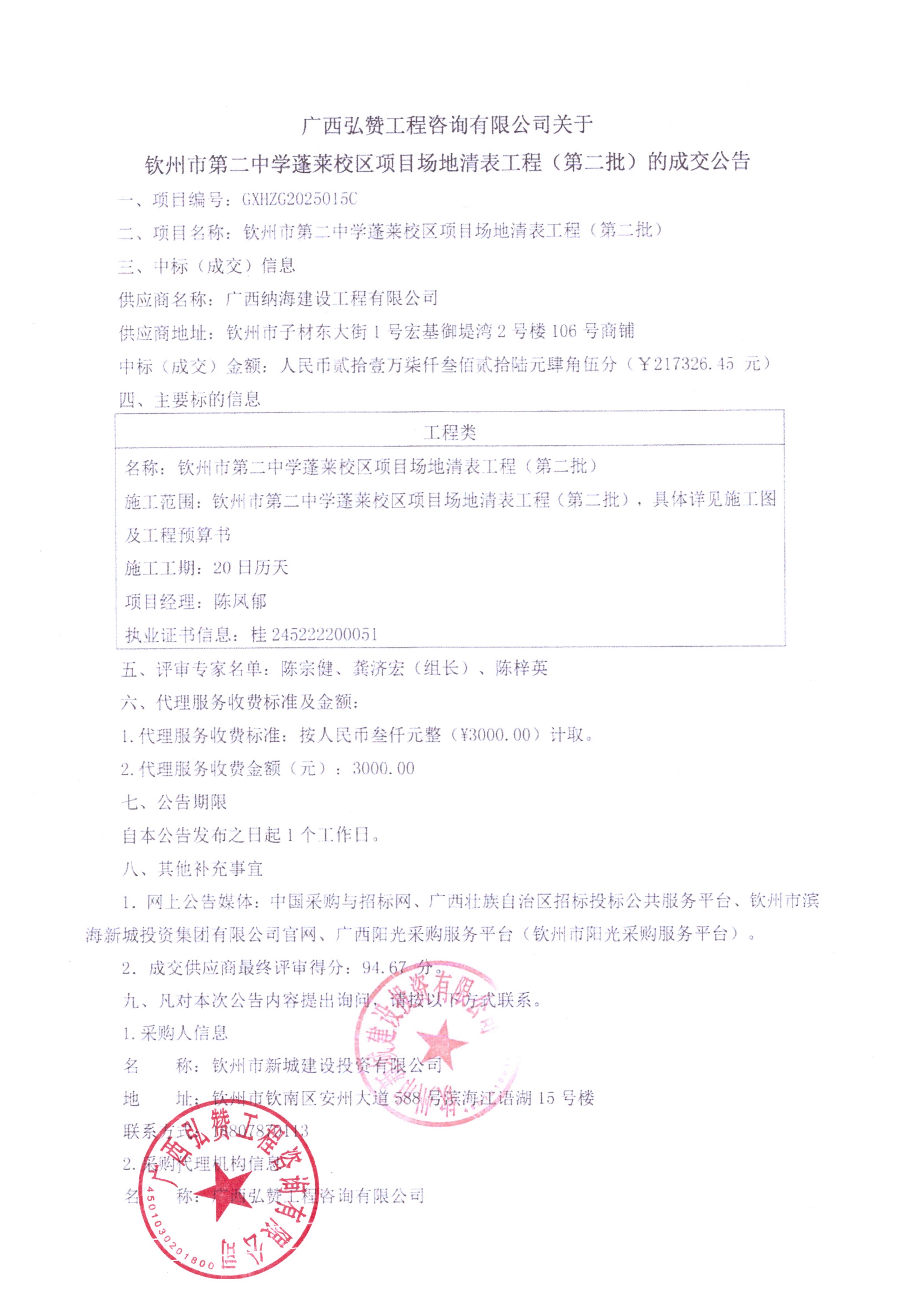 欽州市第二中學蓬萊校區(qū)項目場地清表工程(第二批)成交公告
