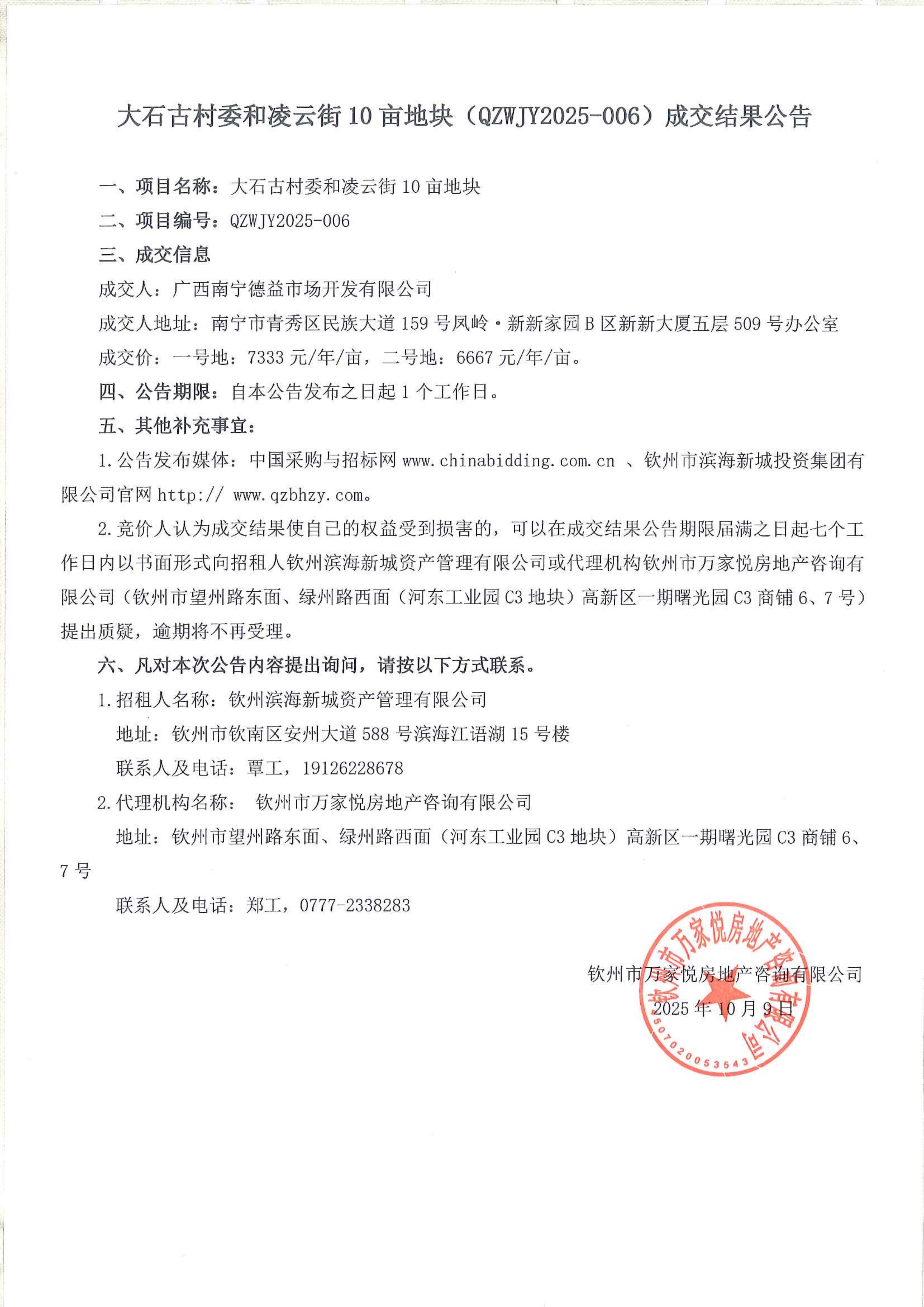 大石古村委和凌云街10畝地塊(QZWJY2025-006)成交結果公告