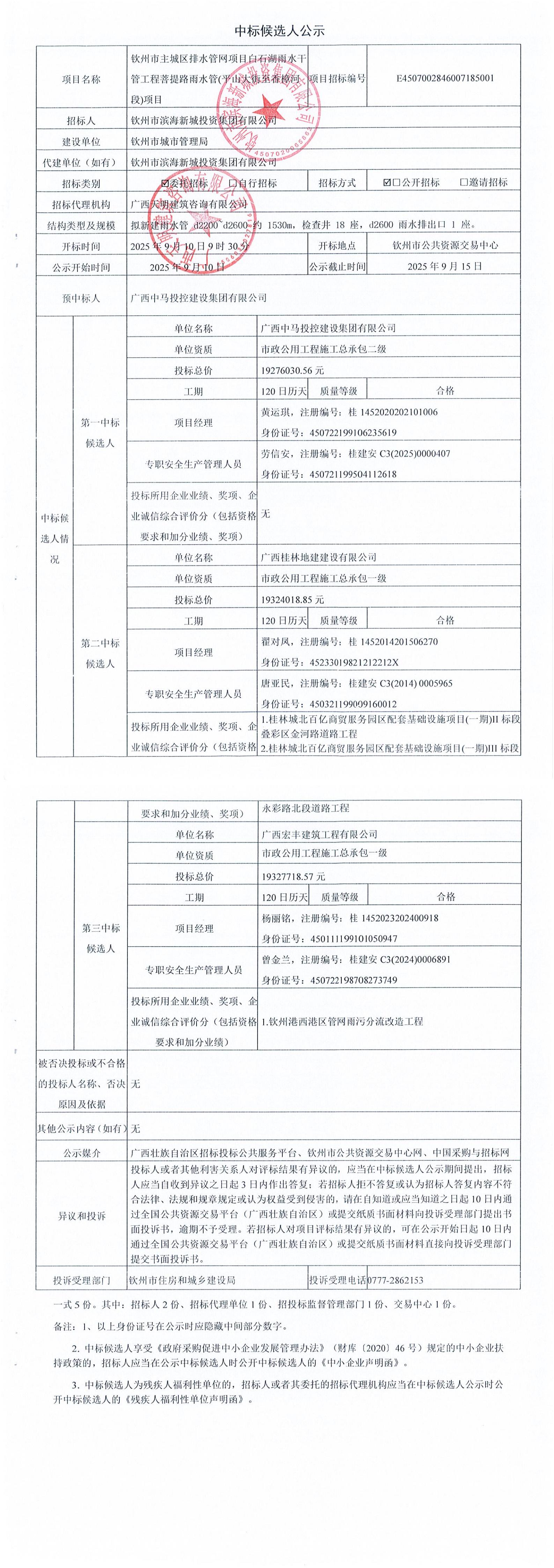 欽州市主城區(qū)排水管網(wǎng)項(xiàng)目白石湖雨水干管工程菩提路雨水管(平山大街至香樟河段)項(xiàng)目中標(biāo)候選人公示