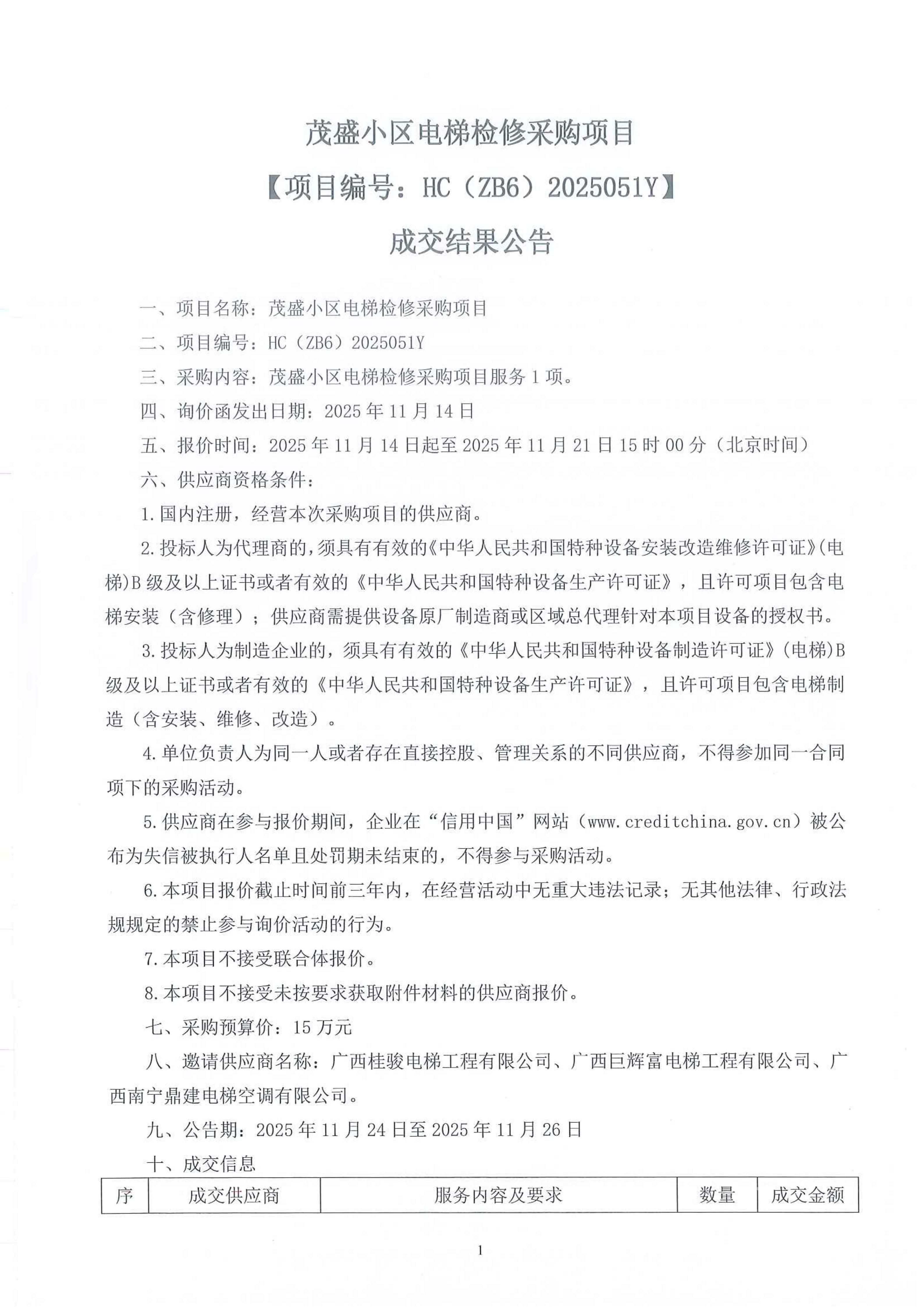 茂盛小區(qū)電梯檢修采購項(xiàng)目【項(xiàng)目編號:HC(ZB6)2025051Y】 成交結(jié)果公告