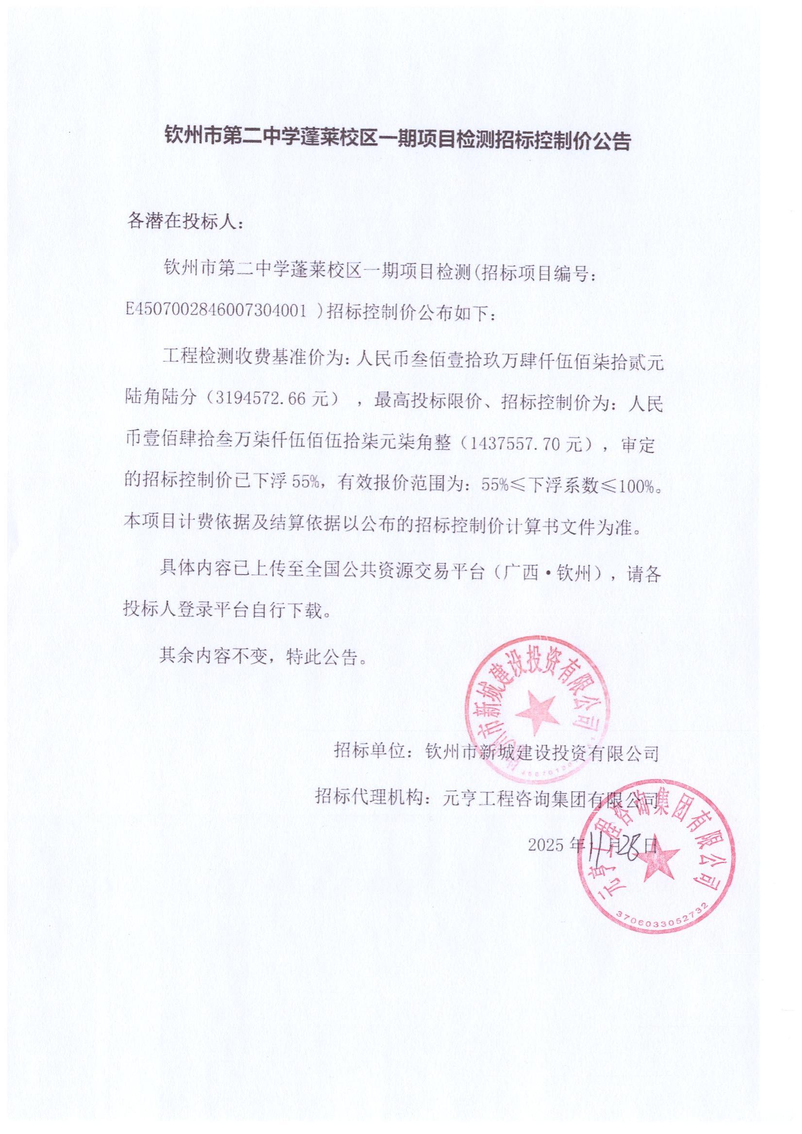 欽州市第二中學(xué)蓬萊校區(qū)一期項(xiàng)目檢測招標(biāo)控制價(jià)公告