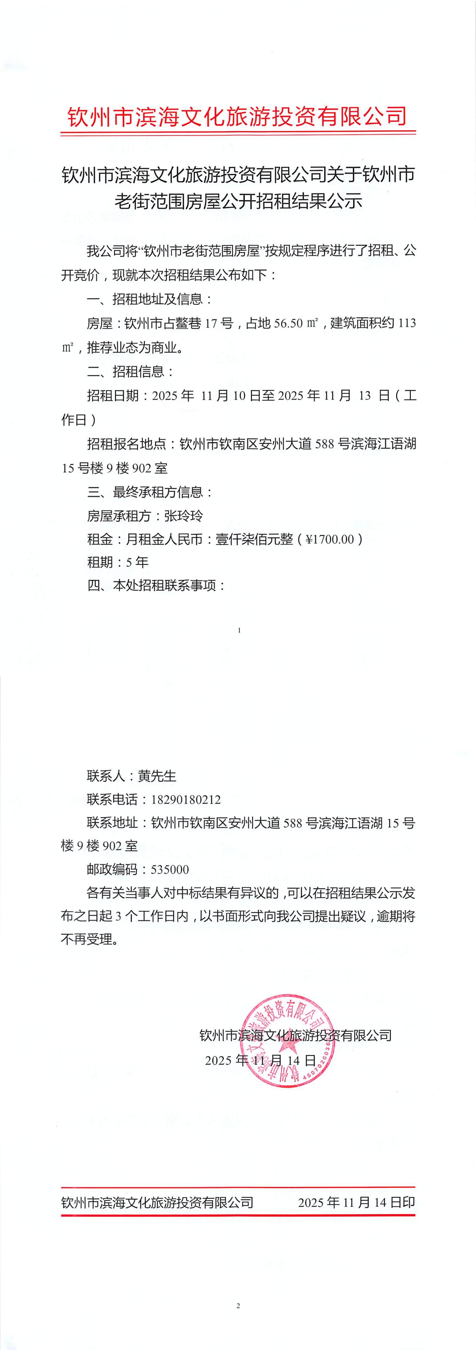 關(guān)于欽州市老街范圍房屋公開(kāi)招租結(jié)果公示(占鰲巷17號(hào))