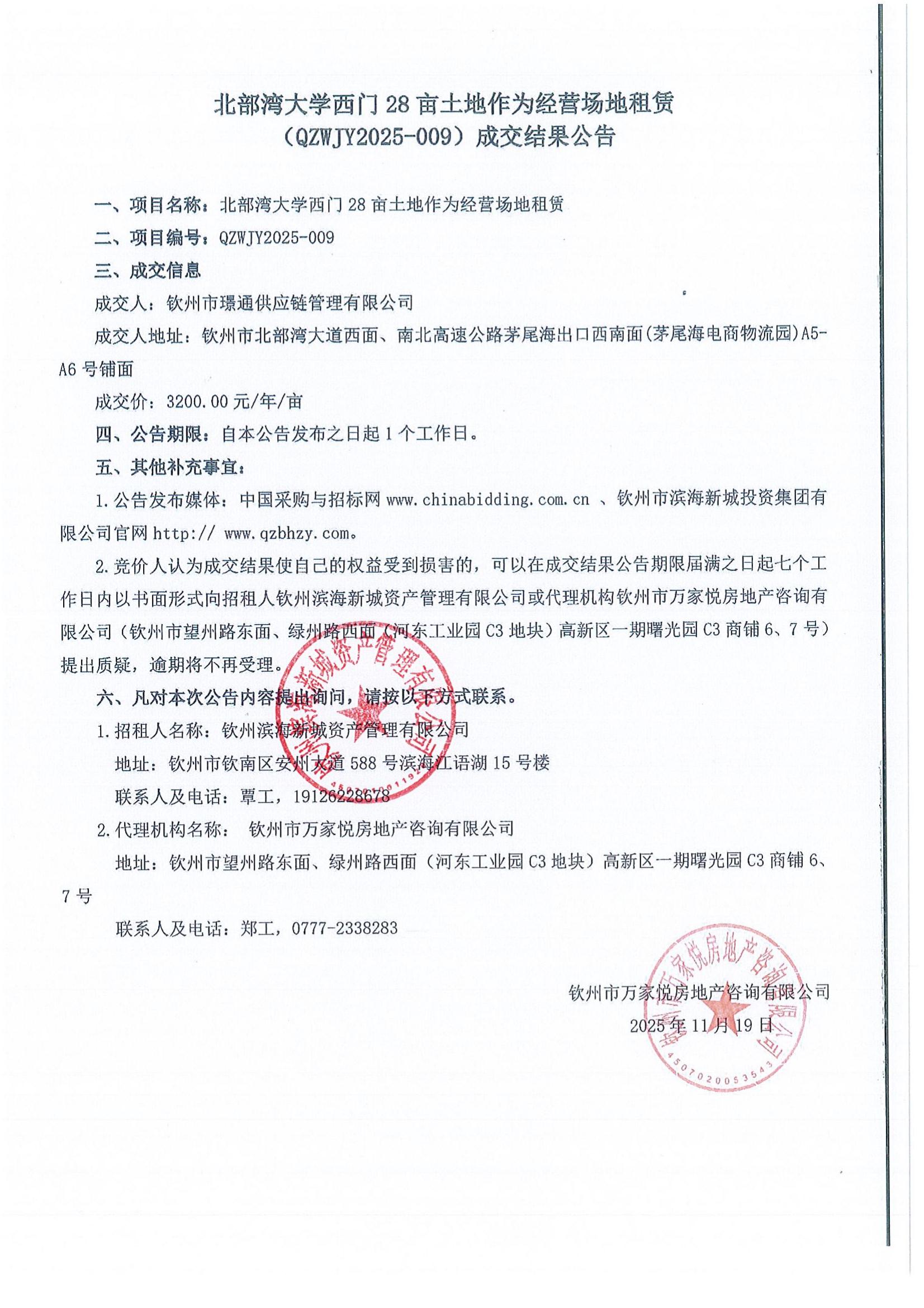 北部灣大學(xué)西門28畝土地作為經(jīng)營(yíng)場(chǎng)地租賃(QZWJY2025-009)成交結(jié)果公告