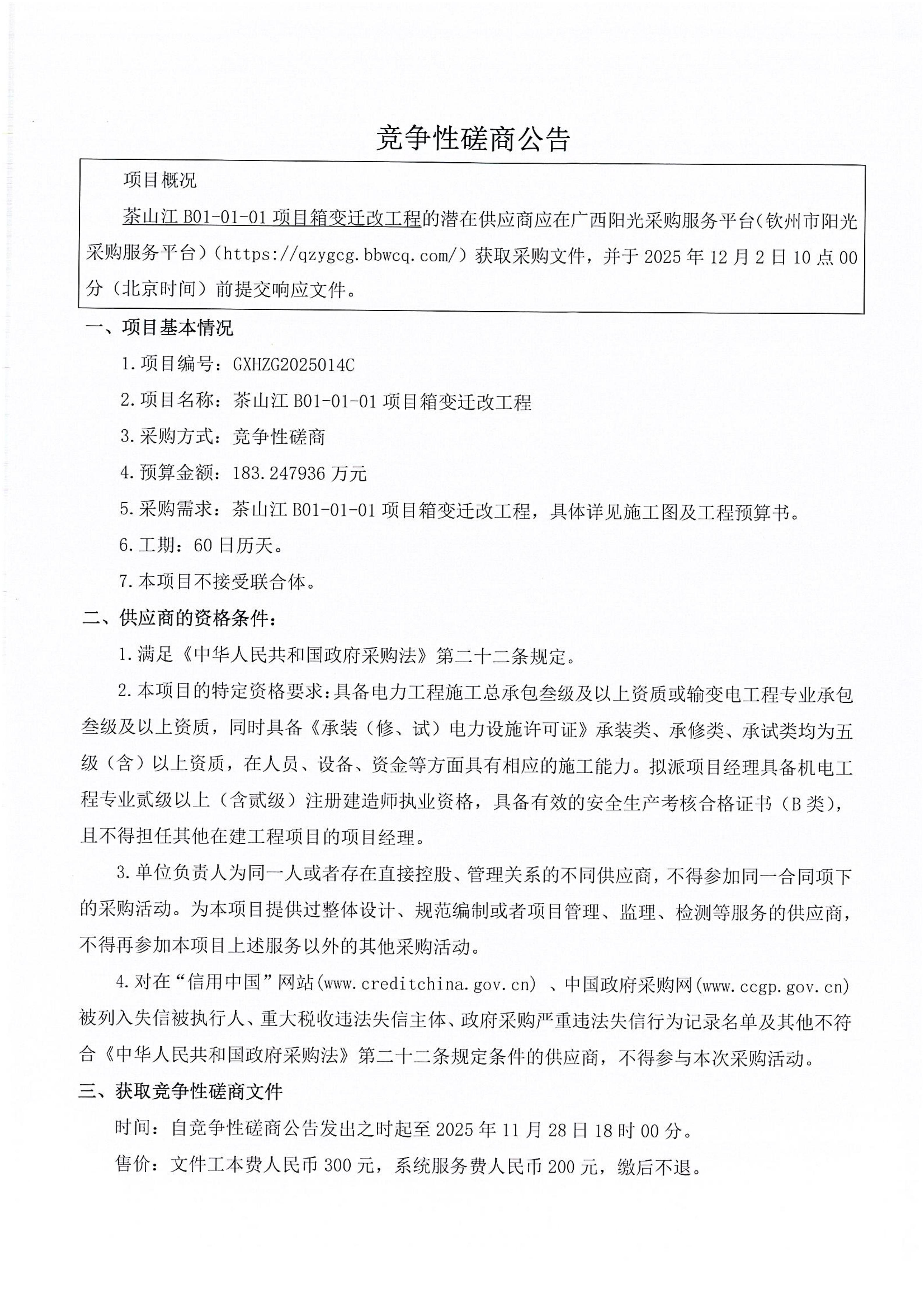 茶山江B01-01-01箱變遷改工程競(jìng)爭(zhēng)性磋商公告