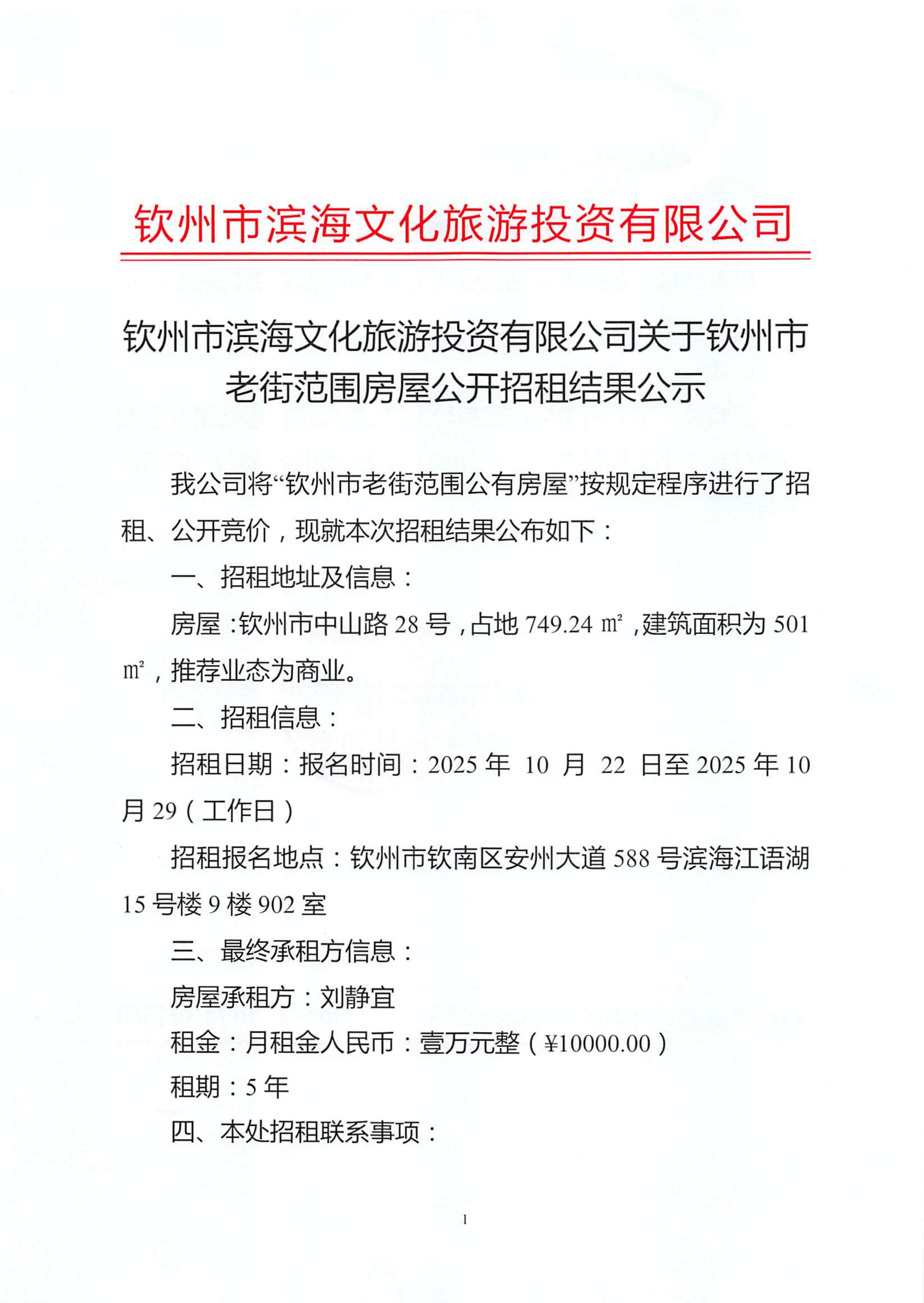 欽州市濱海文化旅游投資有限公司關(guān)于欽州市老街范圍房屋公開招租結(jié)果公示