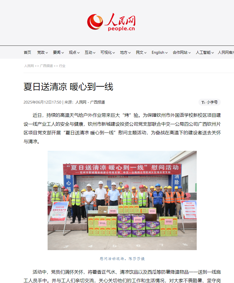 6月12日,人民網(wǎng)-廣西頻道以《夏日送清涼 暖心到一線》為題報(bào)道市濱投集團(tuán)公司黨委下屬建投公司黨支部聯(lián)合中交一公局四公司廣西欽州片區(qū)項(xiàng)目黨支部開展“夏日送清涼 暖心到一線”慰問主題活動(dòng),為奮戰(zhàn)在高溫下的建設(shè)者送去關(guān)懷與清涼,全文如下。