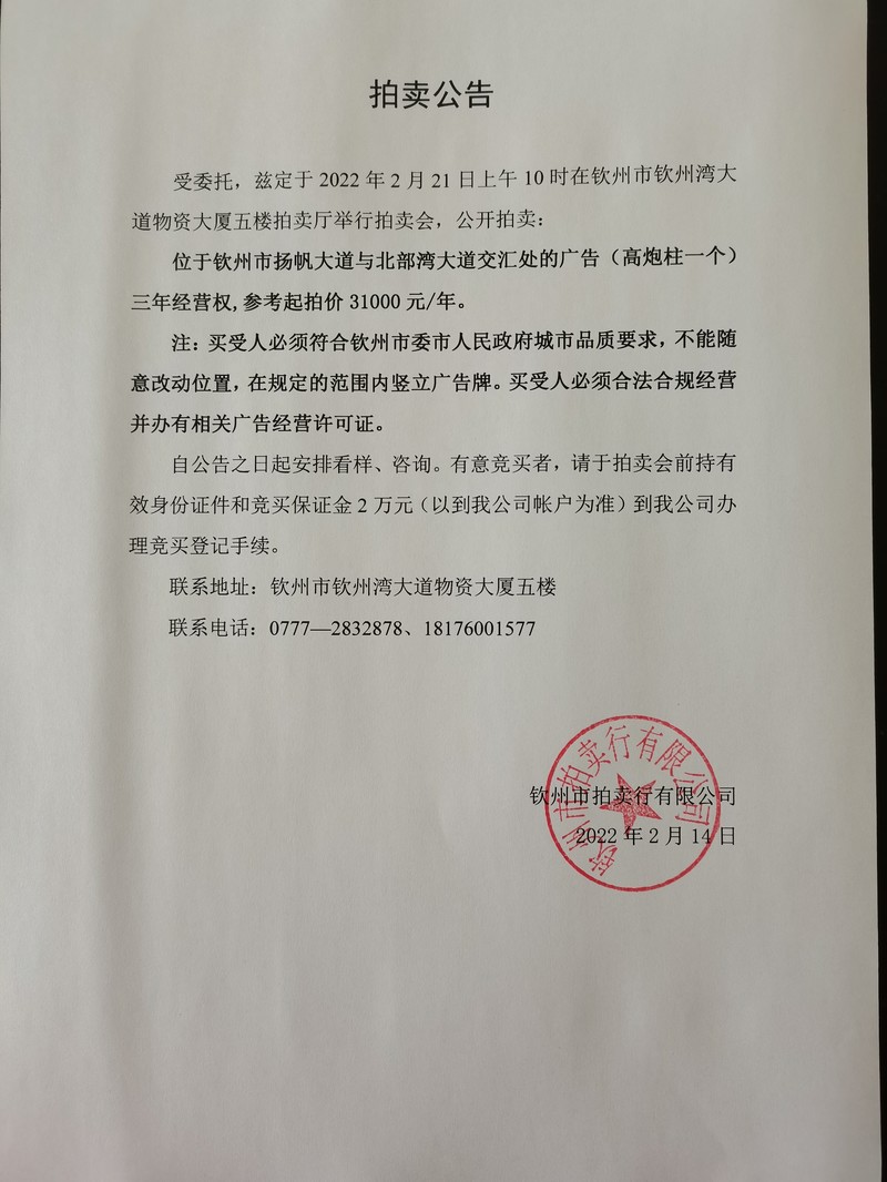 拍賣公告(揚帆大道與北部灣大道交匯處廣告經(jīng)營權)