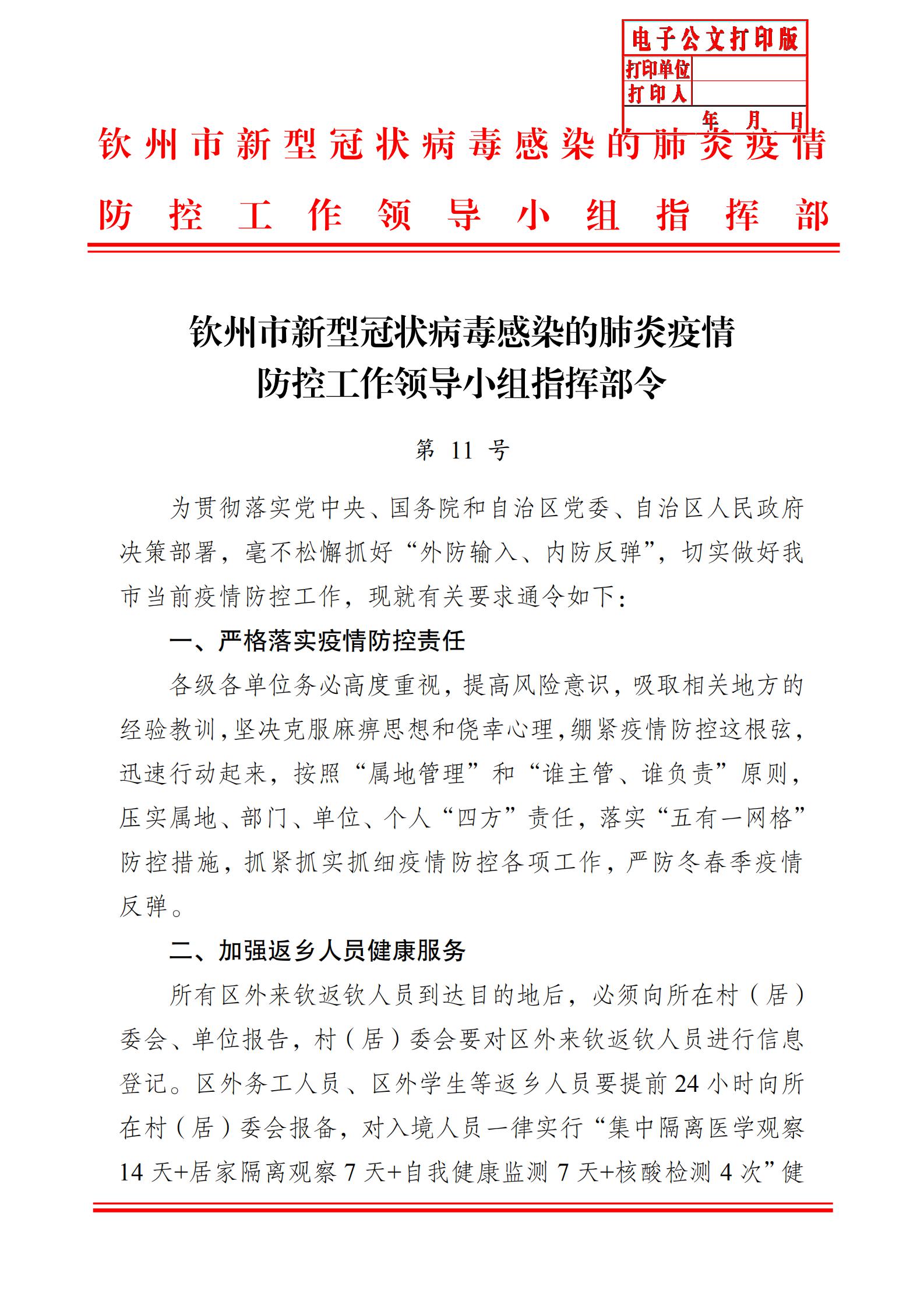 欽州市新型冠狀病毒感染的肺炎疫情防控工作領(lǐng)導(dǎo)小組指揮部令(第11號(hào))