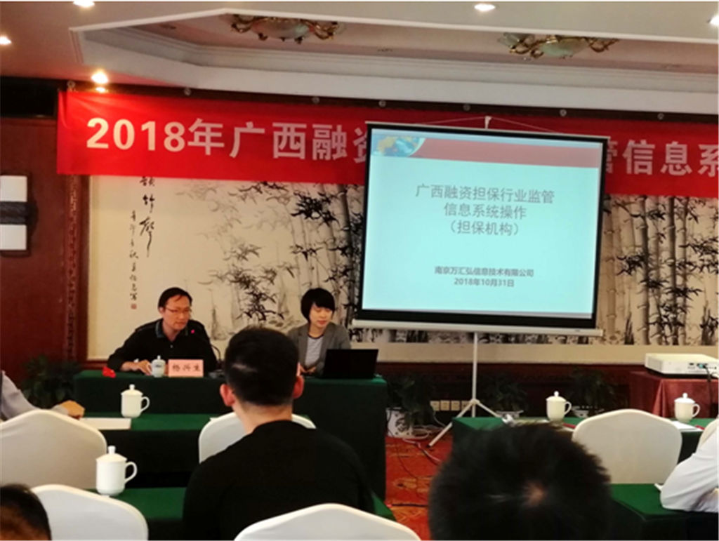 2018年10月31日,由自治區(qū)金融辦組織,在桂林榕湖飯店由系統(tǒng)設(shè)計方南京萬匯弘信息科技有限公司負(fù)責(zé)人陳月對廣西融資擔(dān)保行業(yè)監(jiān)管信息系統(tǒng)操作進(jìn)行培訓(xùn)。