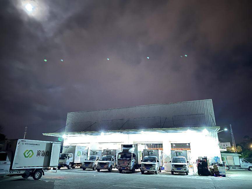 圖為凌晨?jī)牲c(diǎn),濱海食材公共配送中心的倉(cāng)庫(kù)燈火通明,冷鏈車整裝待發(fā)