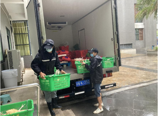 圖為風(fēng)雨無(wú)阻,配送員準(zhǔn)時(shí)安全配送各大考點(diǎn),等待卸貨
