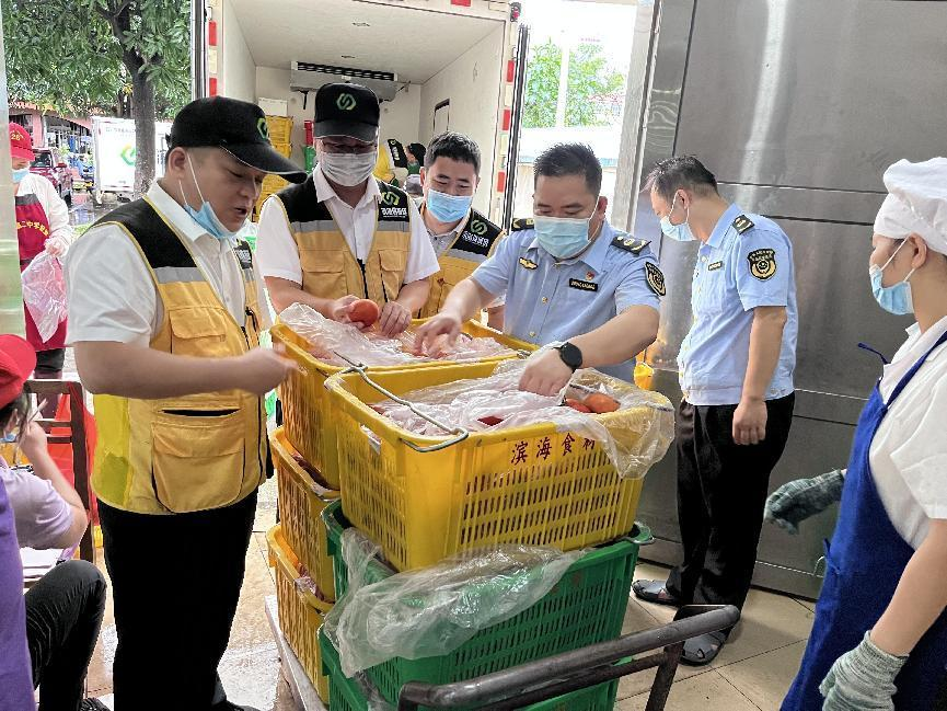 在保供工作進(jìn)行中,濱海供應(yīng)鏈公司始終堅(jiān)持做到:一、主動(dòng)接受行業(yè)主管部門的檢查,積極與市直和南北區(qū)市場(chǎng)監(jiān)管部門保持溝通,按要求做好質(zhì)量把控、索證索票、留樣檢測(cè)等工作;二、從“食材安全衛(wèi)生、配送安全準(zhǔn)時(shí)”為理念,以“五保障”協(xié)議做抓手,工作人員前置農(nóng)產(chǎn)品基地和源頭供應(yīng)商,確保食材質(zhì)量;三、安排食材檢測(cè)員貫徹落實(shí)索證索票工作,嚴(yán)格開(kāi)展檢測(cè)工作,杜絕三無(wú)、有毒有害、過(guò)期變質(zhì)等不良品外流,對(duì)配送的食材共開(kāi)展了306批次食材快檢,確保合格率達(dá)到100%;四、以黨建促業(yè)務(wù),充分發(fā)揮黨支部戰(zhàn)斗堡壘作用,以黨員先鋒隊(duì)作為主力軍前置各考點(diǎn),確保食材保質(zhì)保量以及準(zhǔn)時(shí)到校,并配合食材檢查和驗(yàn)收工作;五、充分利用食安平臺(tái)明廚亮灶系統(tǒng),有力監(jiān)控跟蹤保障食材安全配送,同時(shí)強(qiáng)調(diào)產(chǎn)品溯源,加強(qiáng)校企聯(lián)動(dòng),做好應(yīng)急準(zhǔn)備。