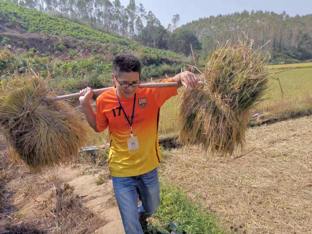 (圖為集團(tuán)公司駐村工作隊(duì)員謝新平同志在田間幫助困難群眾將收割的稻谷挑回家) |