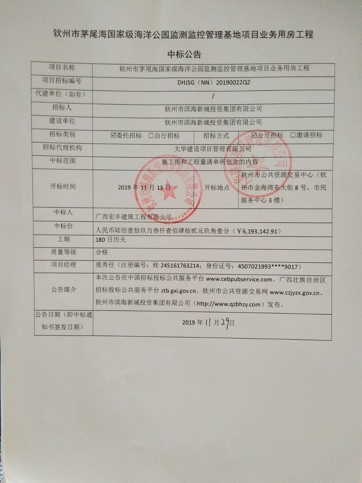 欽州市茅尾海國家級海洋公園監(jiān)測監(jiān)控管理基地項目業(yè)務(wù)用房工程-中標(biāo)公告
