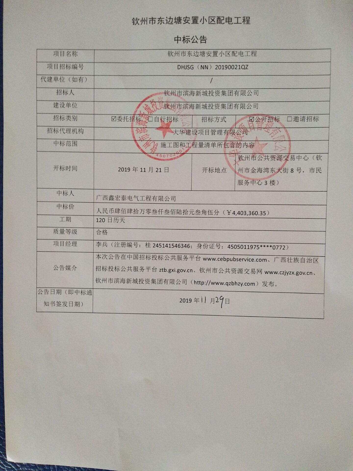 廣西建設(shè)工程機電設(shè)備招標(biāo)中心有限公司 欽州火車東站西北面、南北二級公路南面地塊租賃 (項目編號:FC(QZ)2019001G) 中標(biāo)結(jié)果公告
