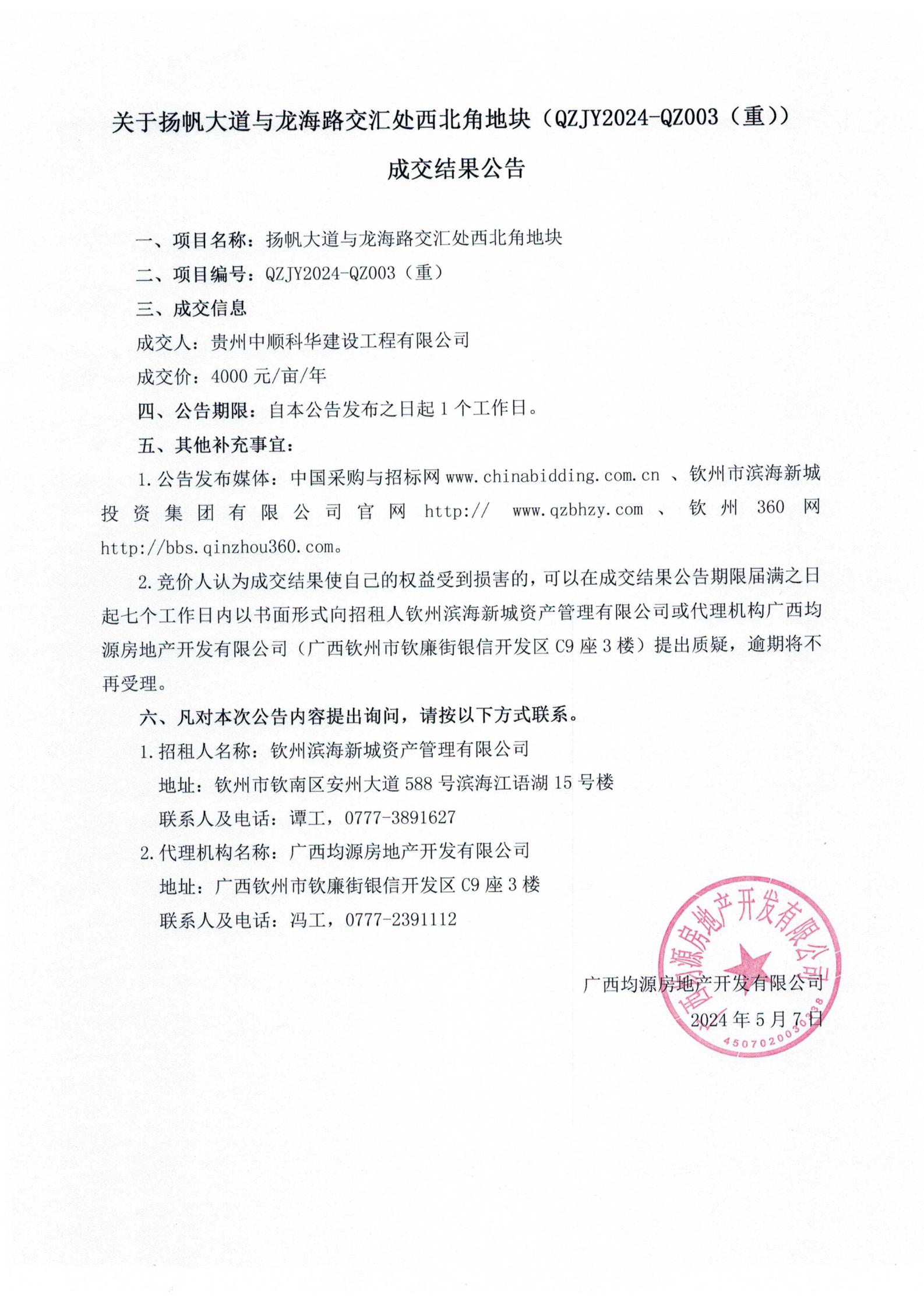 關(guān)于欽州市濱海新城投資集團(tuán)有限公司綜合展示廳成交結(jié)果公告