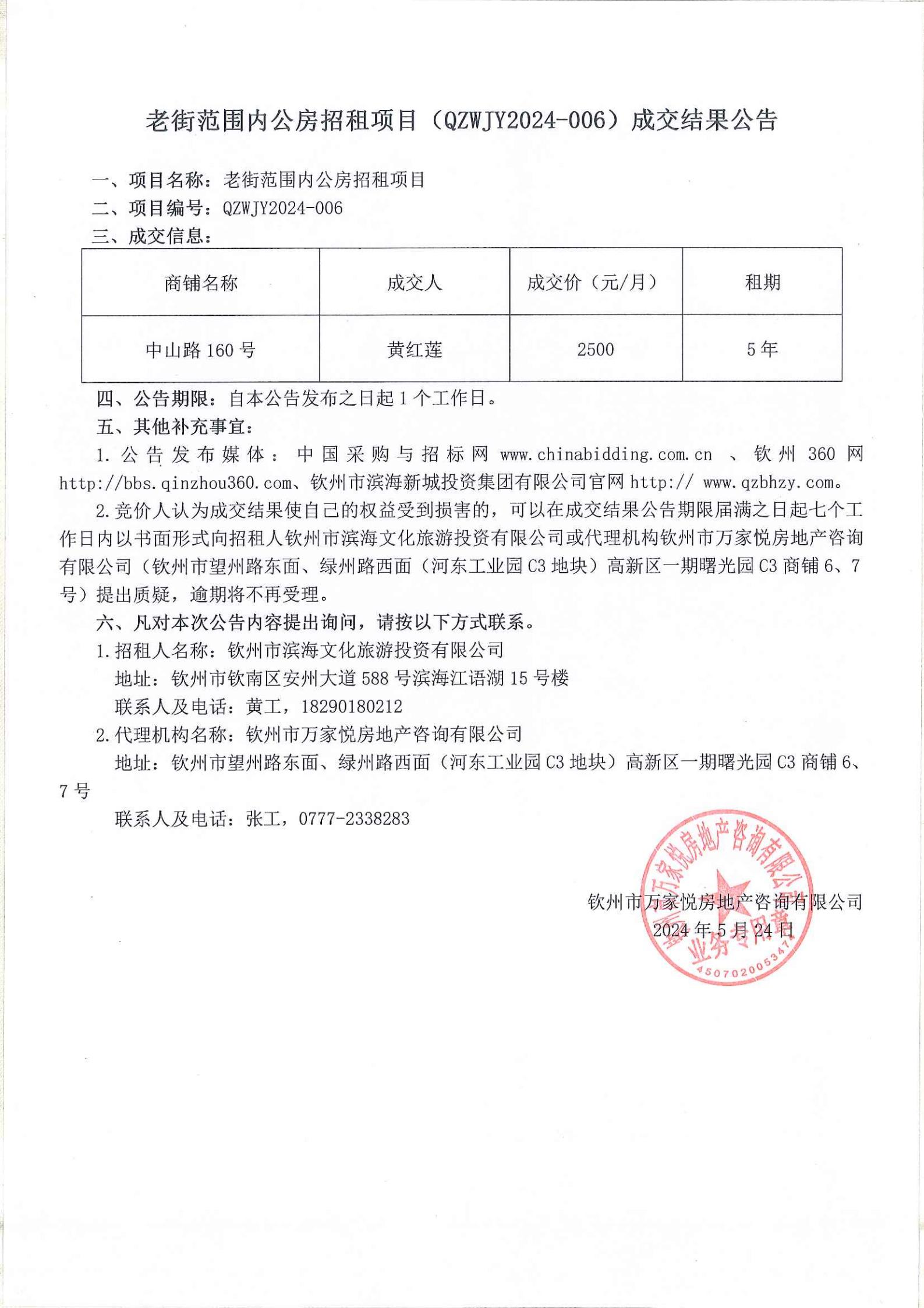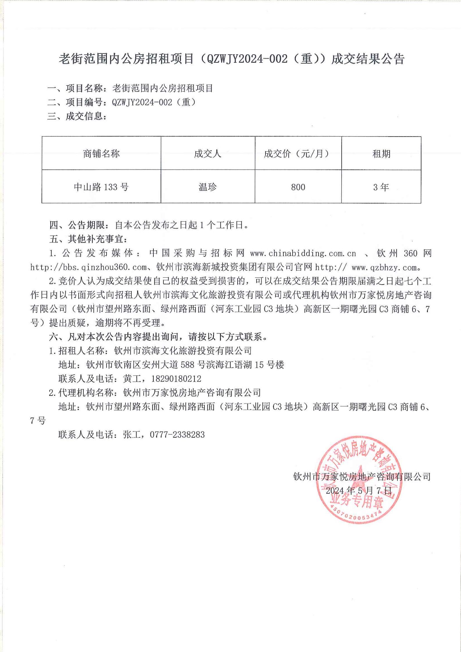 關(guān)于欽州市老街范圍中山路49號(hào)房屋公開(kāi)招租結(jié)果的公示