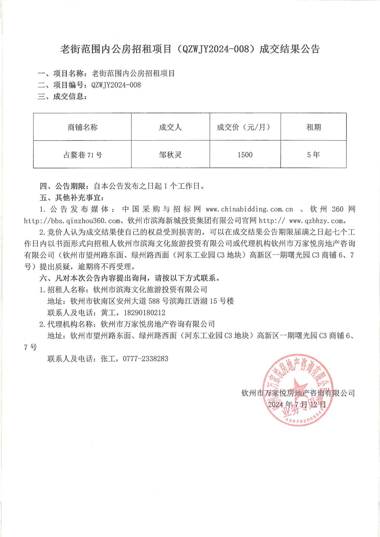 老街范圍內(nèi)公房招租項(xiàng)目(QZWJY2024-008)成交結(jié)果公告(占鰲巷71號(hào))