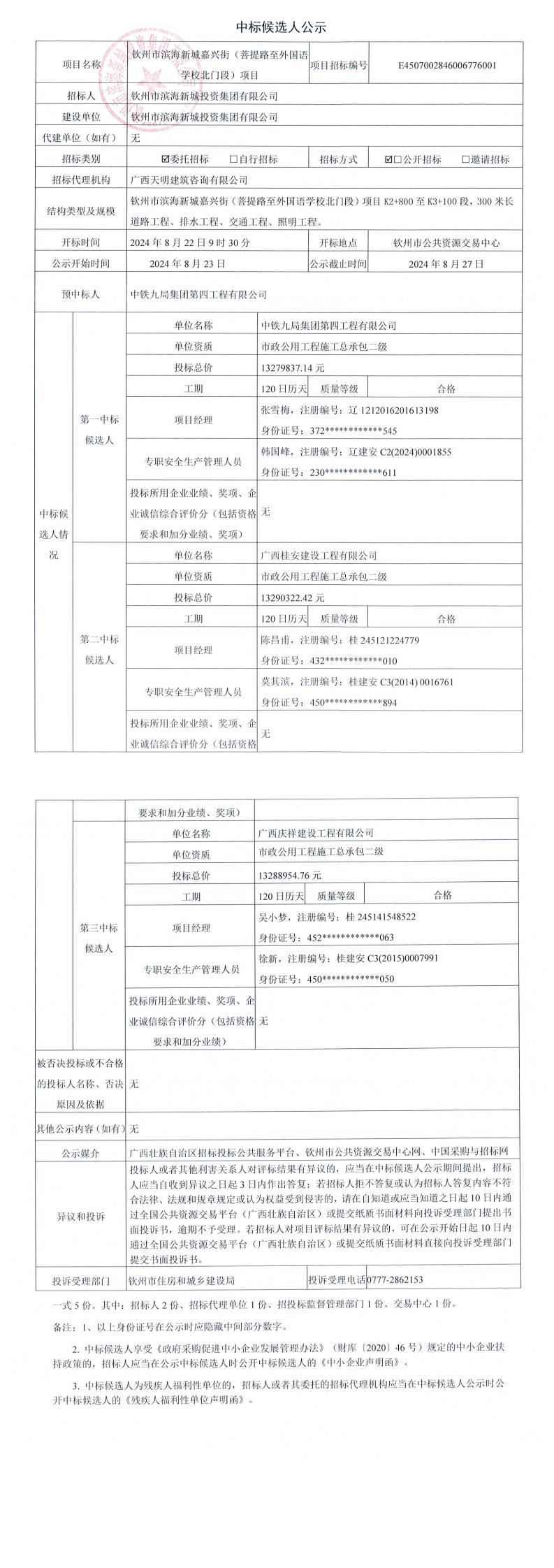 欽州市濱海新城嘉興街(菩提路至外國(guó)語(yǔ)學(xué)校北門(mén)段)項(xiàng)目中標(biāo)候選人公示