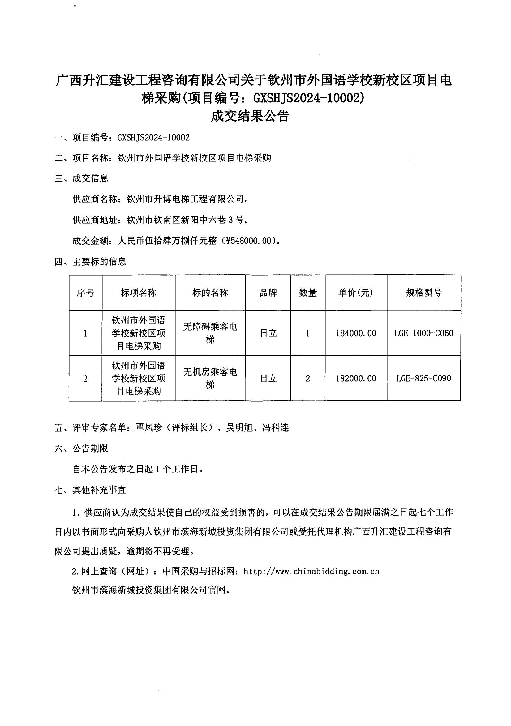 廣西升匯建設(shè)工程咨詢有限公司關(guān)于欽州市外國(guó)語(yǔ)學(xué)校新校區(qū)電梯采購(gòu)成交結(jié)果公告
