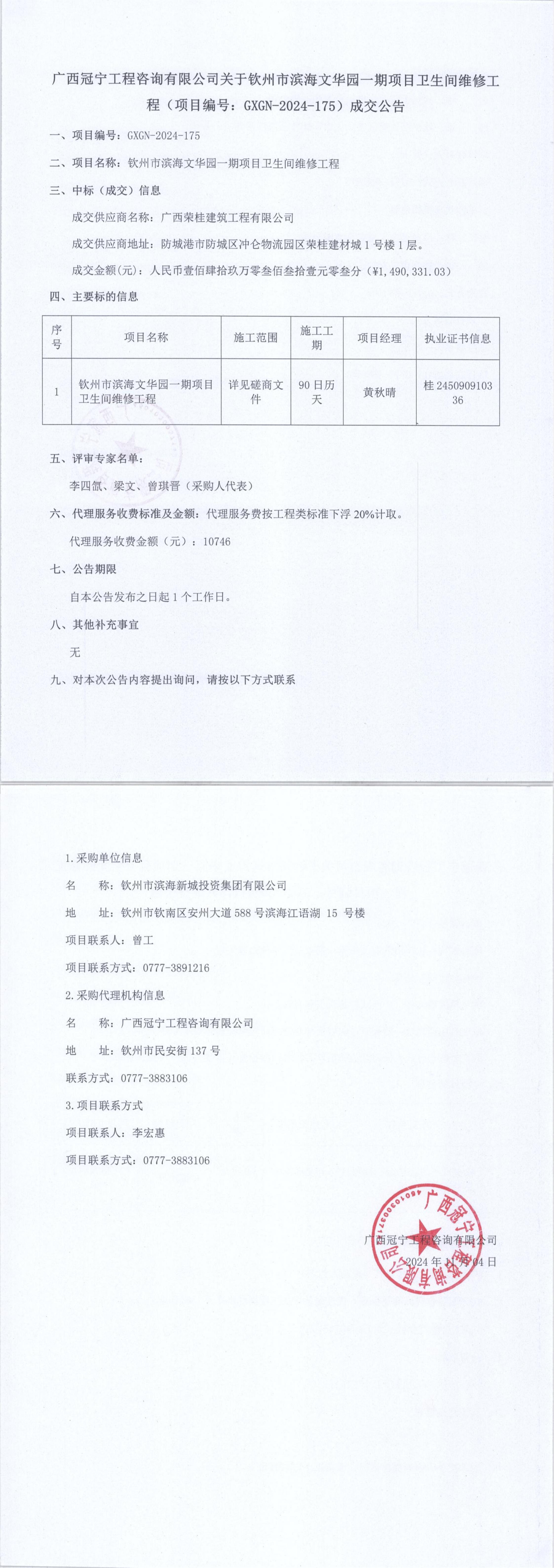 廣西冠寧工程咨詢有限公司關(guān)于欽州市濱海文華園一期項(xiàng)目衛(wèi)生間維修工程(項(xiàng)目編號(hào):GXGN-2024-175)成交公告