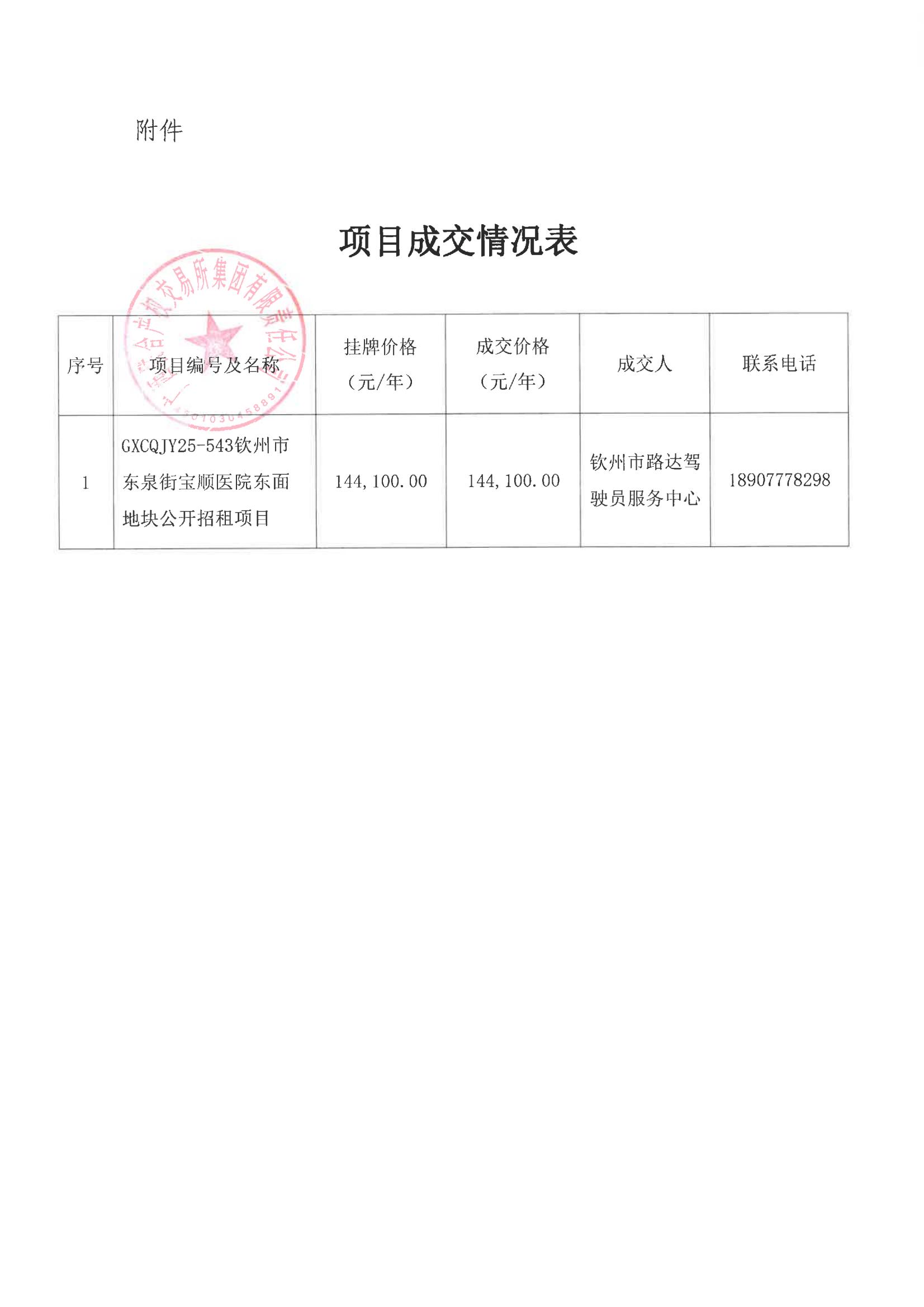 關于欽州市東泉街寶順醫(yī)院東面地塊公開招租項目成交情況的函