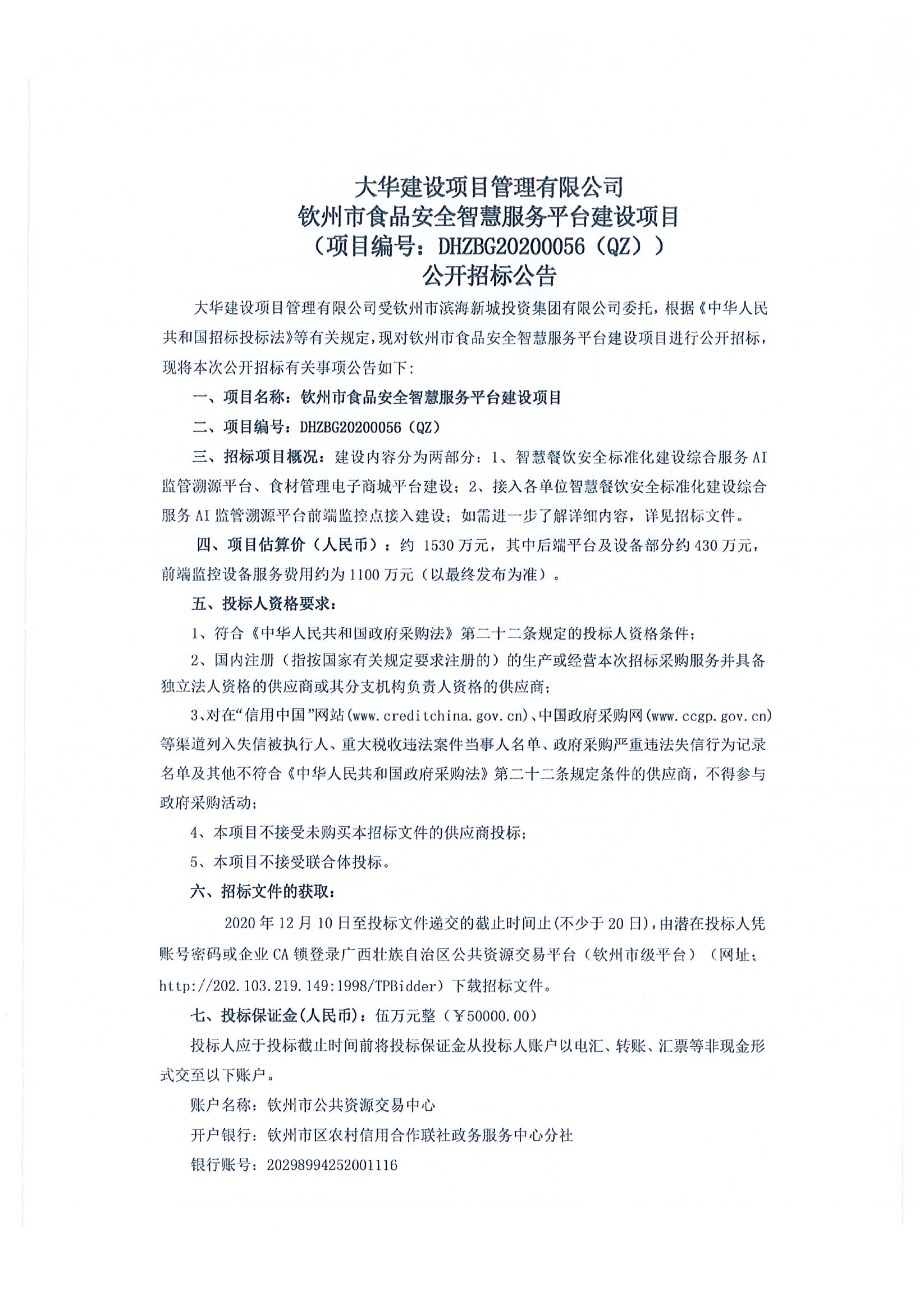 欽州市食品安全智慧服務平臺建設項目公開招標公告