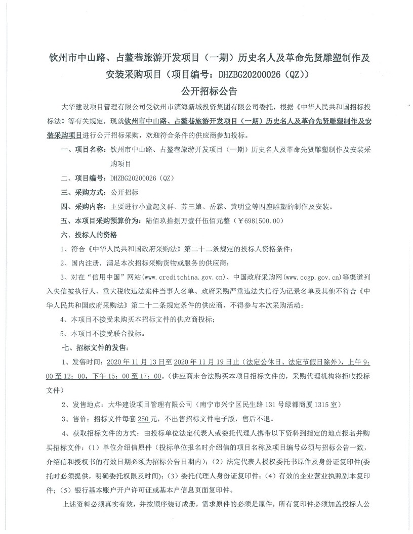欽州市中山路、占鰲巷旅游開發(fā)項目(一期)歷史名人及革命先賢雕塑制作及安裝采購項目公開招標公告