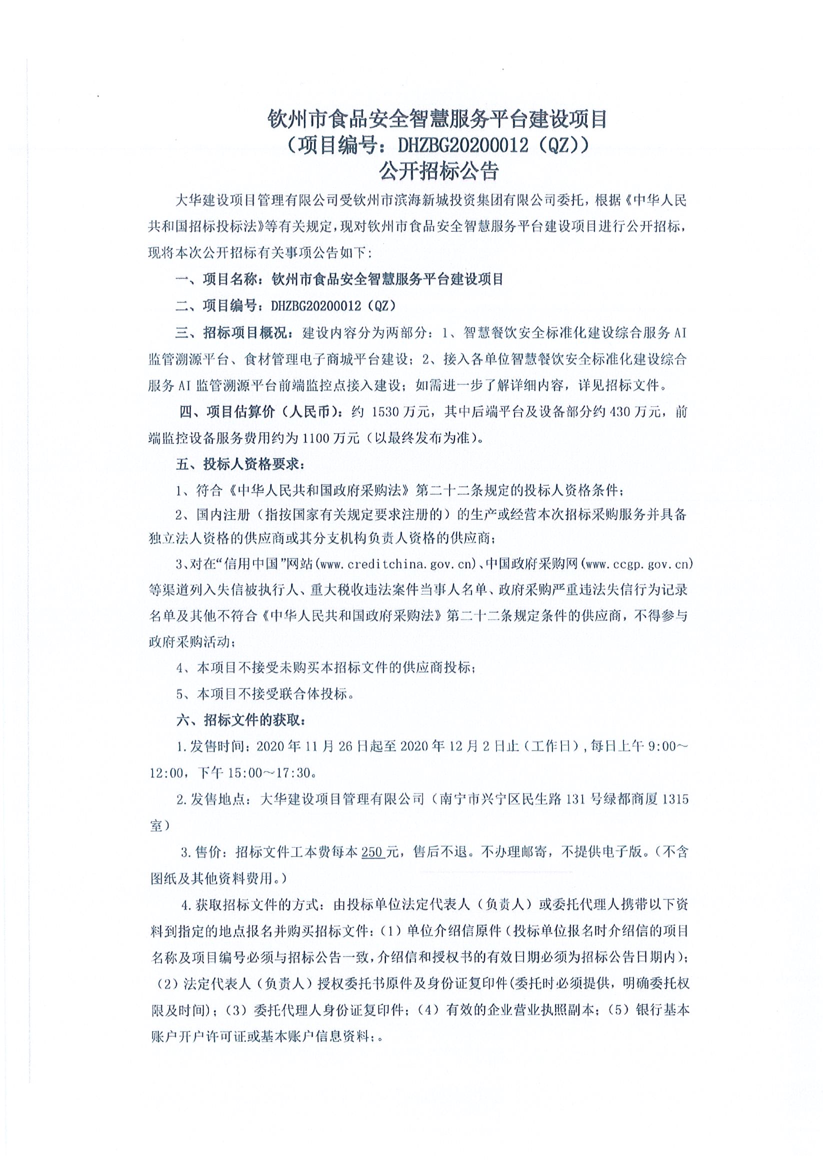 欽州市食品安全智慧服務(wù)平臺建設(shè)項目公開招標公告