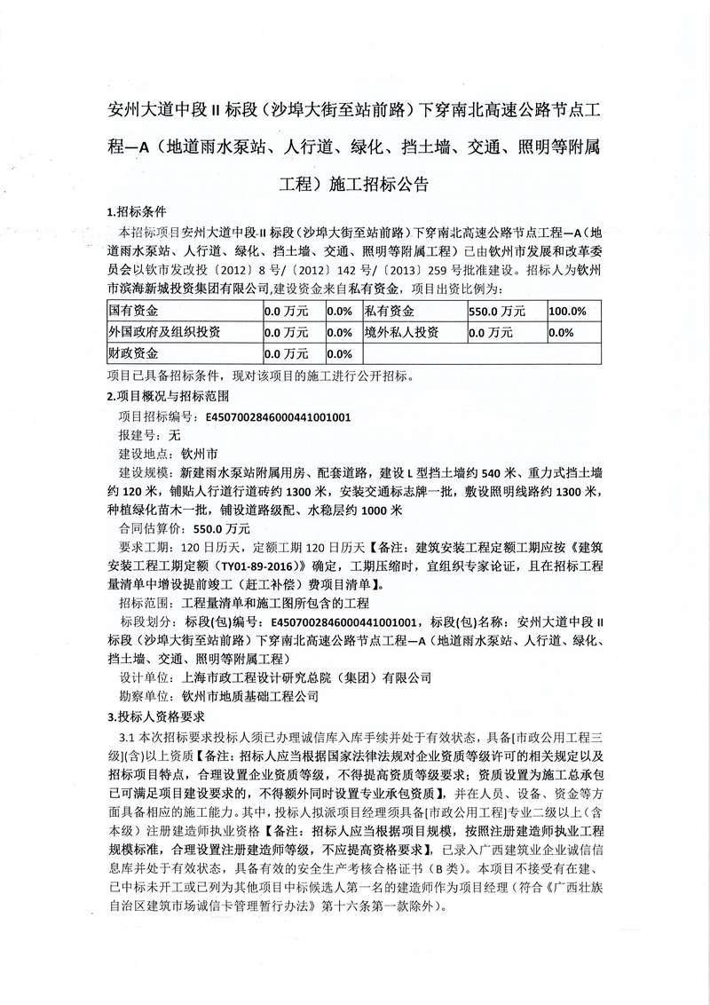 安州大道中段II標段(沙埠大街至站前路)下穿南北高速公路節(jié)點工程—A(地道雨水泵站、人行道、綠化、擋土墻、交通、照明等附屬工程)施工招標公告