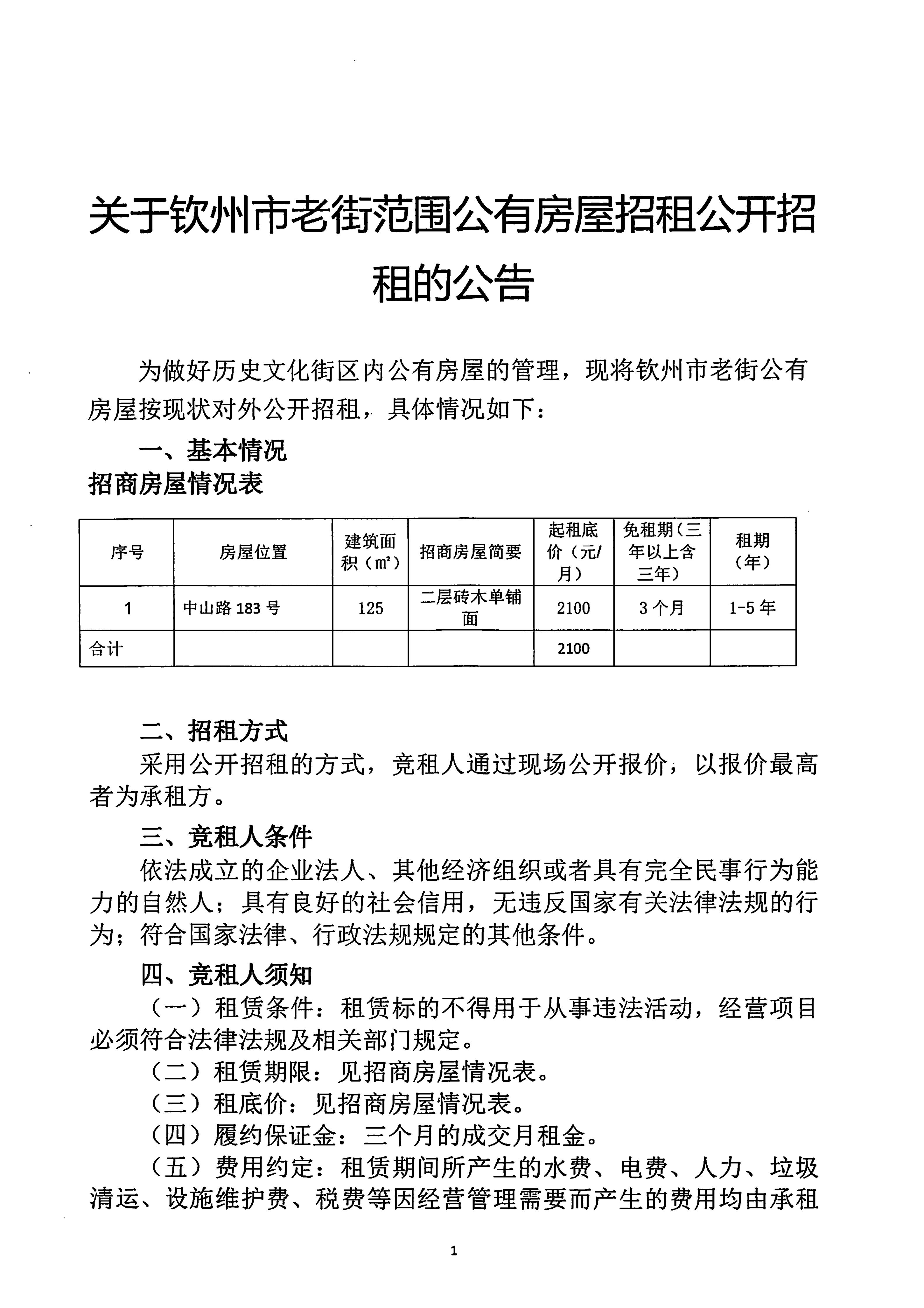 關(guān)于欽州市老街范圍公有房屋招租公開招租的公告(中山路183號(hào))